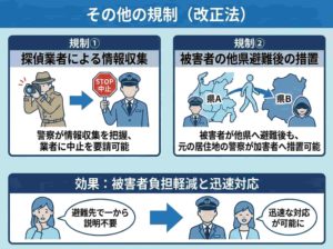 探偵業者を使った情報収集を警察が把握した場合、業者に中止を要請できる規定が追加されました。また、被害者が他県に避難した後も、元の居住地の警察が加害者への措置を取れるようになります。