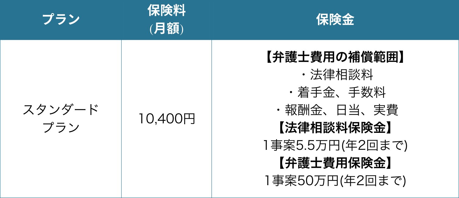 保険料の相場は月額3,000円程度です。弁護士費用は、着手金だけでもまとまった金額が必要となり、さらに成功報酬等が加わる場合もあります。