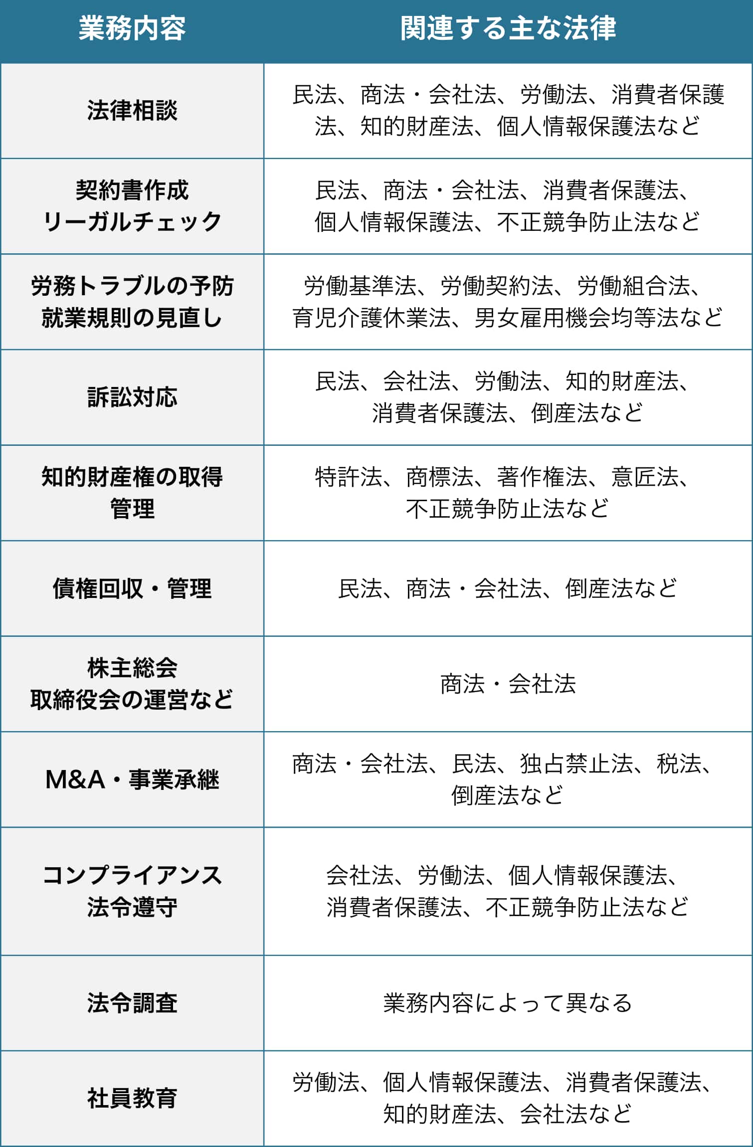 - 企業法務とは、会社経営に関する法律問題の予防や対応を担う業務のこと
