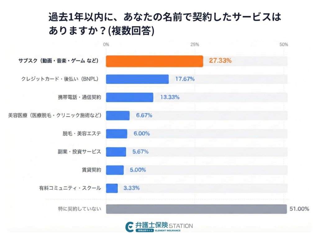 また、過去1年以内に自分名義で契約したサービスについては、サブスクが約27%で最も多く、次いでクレジットカードや通信関連が続きました。