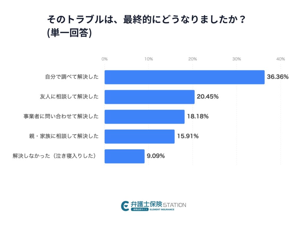 トラブル後の対応としては、「自分で調べて解決した」が最も多い一方、解決に至らなかった回答も一定数見られました。